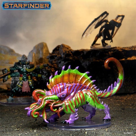 Starfinder Battles: Planets of Peril releases next month, and we’re well into our exploration of what strange aliens you can find in every booster box. Last week we looked at the set’s starships, including three vesk models, so let’s look at some of the creatures from the Veskarium you can find in the set.