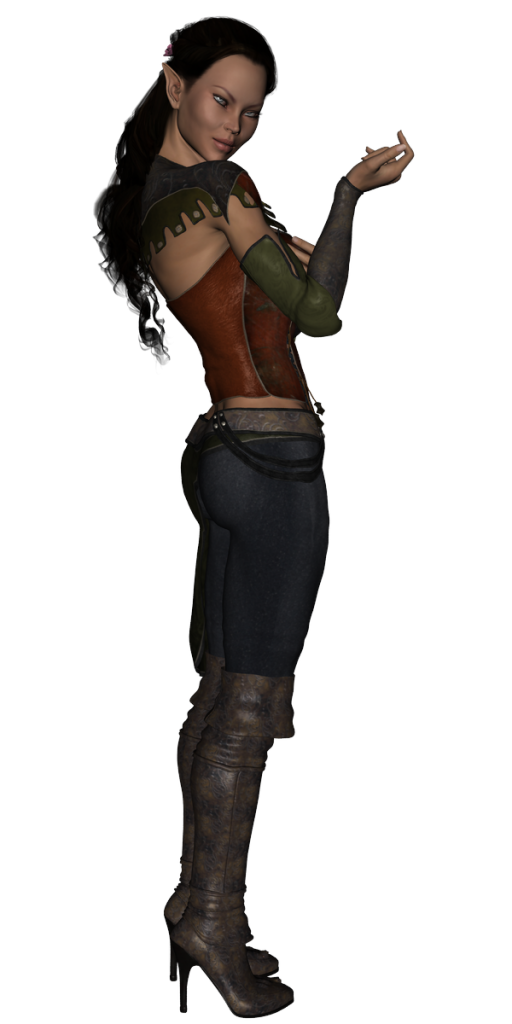 You see a elven woman of 5 foot 6, small and child like with pale skin and violet eyes. Her hair is light brown and waist length, often braided with flowers or leaves. Wearing light brown armor with green trim. And almost always wearing a wide brim hat to keep the sun out of her eyes