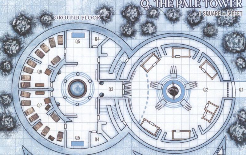The little group arrives, as far as they can tell, undetected. From here, Kazmir can see the Pale Tower, rising like a jagged icicle with spiky protrusions. He is near the walled courtyard to the east.