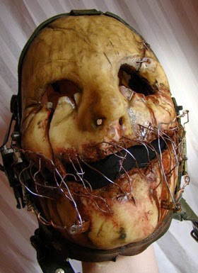 The third is a male half-orc. He wears a hideous looking mask. He has a buckler, but no other visible weapons or armor.