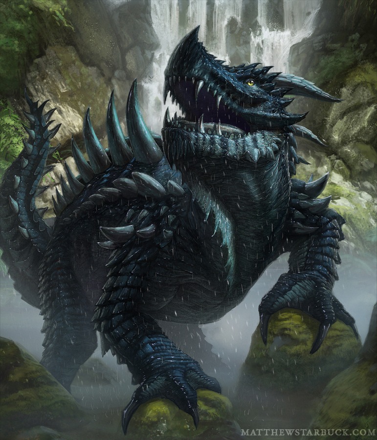 While Fa'zakar was ready for the ogres, he was caught a bit off-guard by the huge crocodile/reptilian beasts that came suddenly into, and almost through, the web trap. He raises his bow and draws back, aiming at the lead creature.
