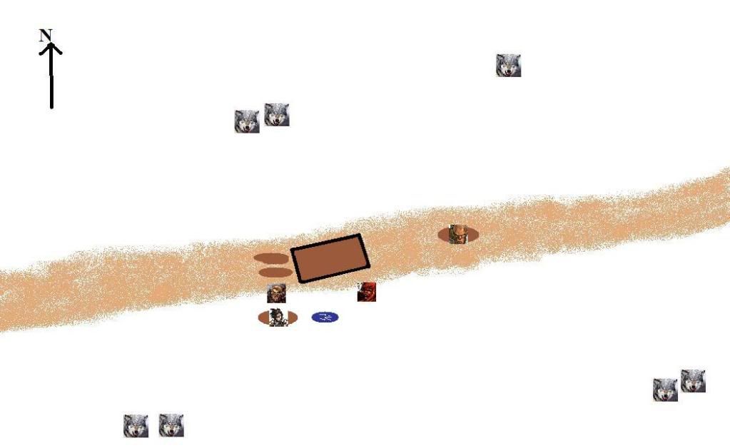 I may be incommunicado tomorrow for a bit--if my absence impacts the battle and things need to roll forward, Erian holds his position. On round 1 he uses his Standard Action to Inspire Courage (+1 Morale bonus on saves vs. charm and fear effects, +1 Competence bonus on attack and weapon damage rolls) and his Move Action to ready his bow. On round 2, he attacks with his bow, targeting any wolf that has already taken damage.