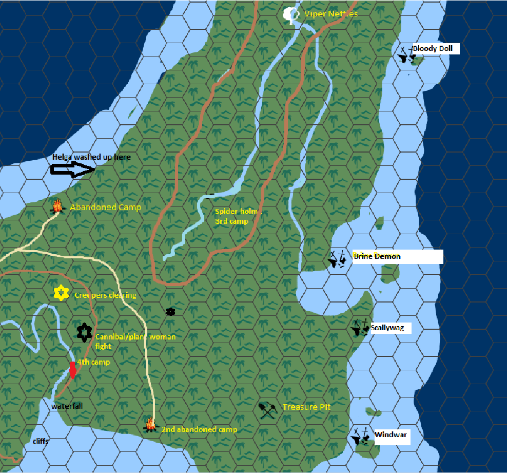 Atzi looks at Helga with tired eyes. "We found an abandoned encampment, looked to have been built by survivors like us and they were attacked and wiped out. I assume it was the work of the feral savages we have seen but perhaps there are more tribes on this island...." She shuddered before continuing to speak. "Whoever these survivors were, they were killed savagely. Old blood stains and hack marks mar the structures and sail cloth they used. We couldn't find anything useful in the camp. We will have to move our camp again before we are noticed, so tomorrow prepare to press hard into the jungle everyone, because we can't stay here."
