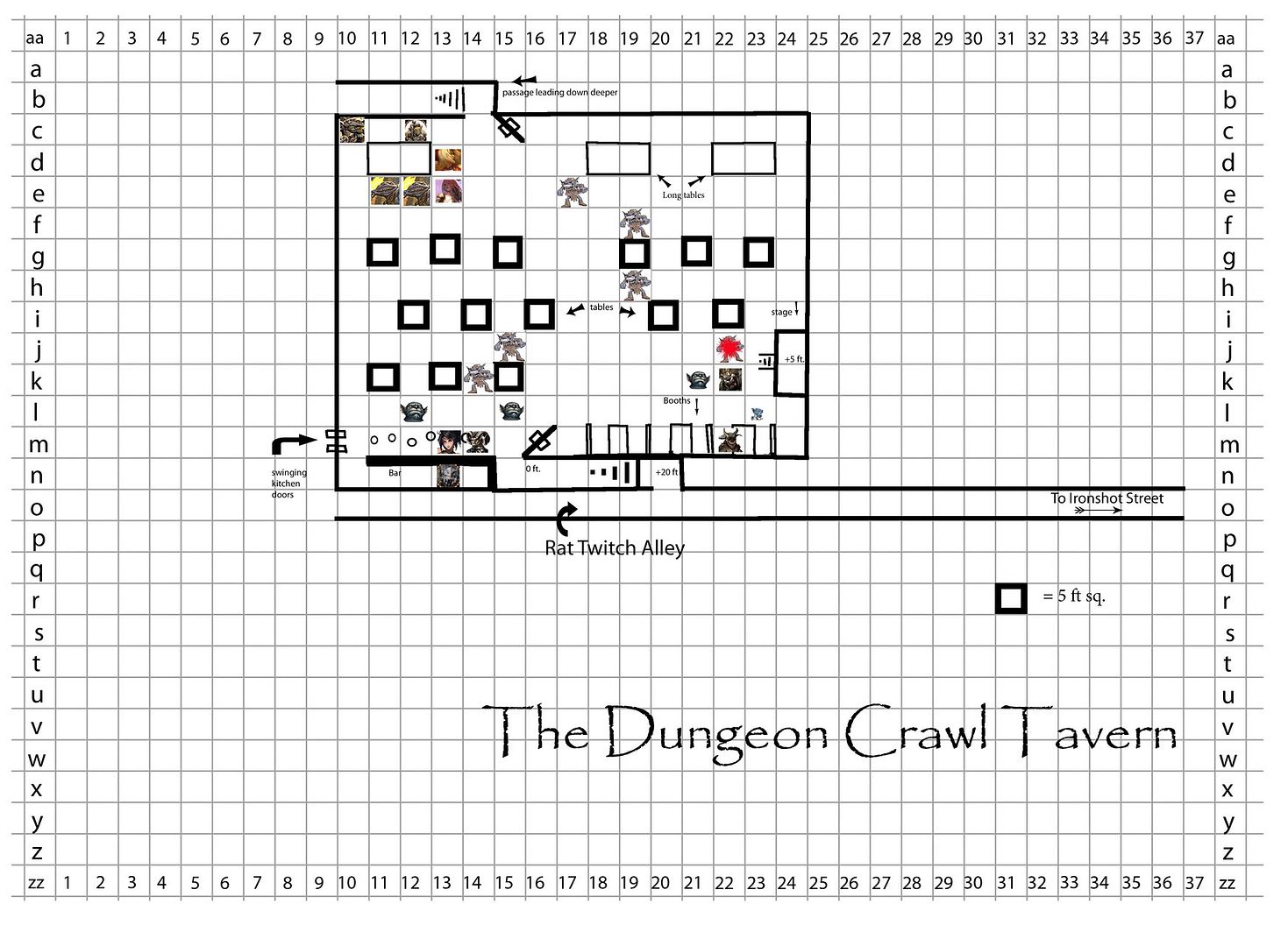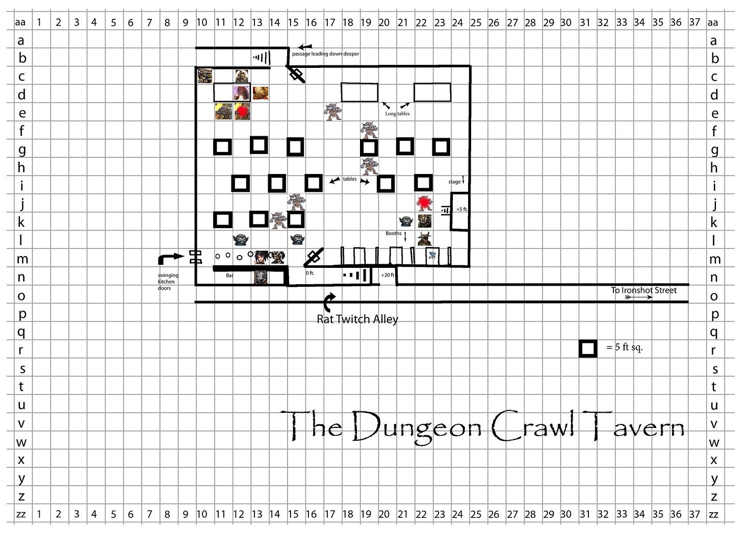 Acrobatics (1d20+13=30) to get over the bar. She's keeping an eye out, hoping to get a sneak attack off at someone flanked next round, but also keeping an ear out for the bartender getting involved in the situation.