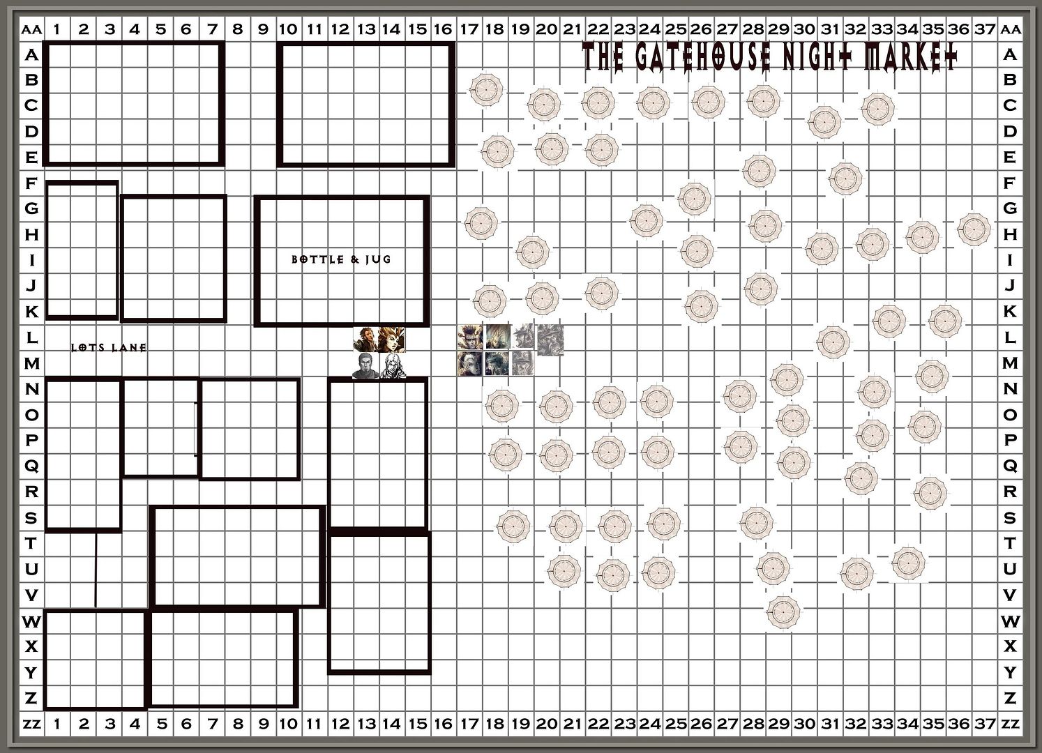 A crowd of Night Market patrons start to notice the brawl, and begin to crowd about. Faces can be seen pressed against the Bottle & Jug's small barred windows cut into its black stone facade. A pair of lagre ugly goblinoids flank the tavern's entrance, and bar it against entry by anyone.