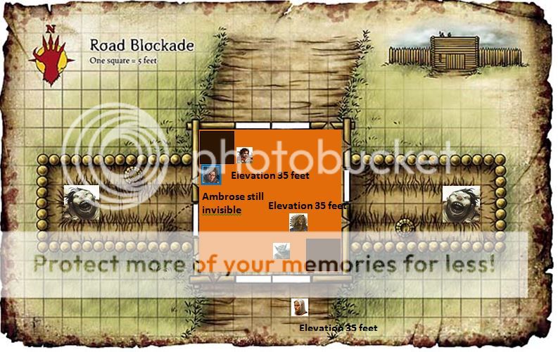 Aleste - thanks for the confirmation re smoke bombs. I thought that was the case, but the APG doesn't make it clear. I'll apply splash damage to those who would have been caught in the blast. Aleste, Helaku, and Shaylar are all still in the air, and spell is still in effect for all of you. I had map tags indicating your altitude, but I see they've wandered about a bit. At an elevation of 35 feet, you are 15 feet above the top of the stockade tower and those standing there. My previous description did make it sound like one of the hobbies was standing next to you. :)