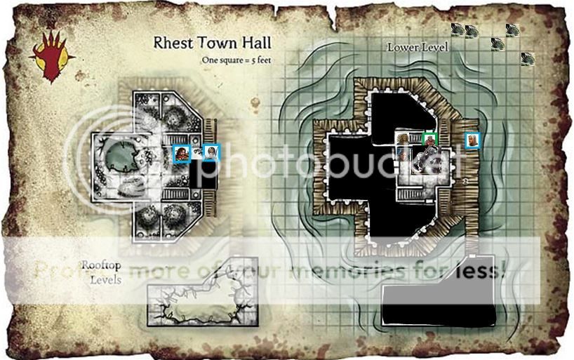 Aleste is sprawled on the rooftop of the town hall, while Trellara lies not far away at the top of one set of stairs leading down to the wooden walkway. Much of the alchemist's flesh has been eaten away by the dragon's acid - really it looks as if one of his own experiments backfired on him. Trellara looks much the same. The hulks of fallen ogres litter the rooftop as well. Shaylar lies in a precarious position on wooden planking that has been eaten away by acid breath.