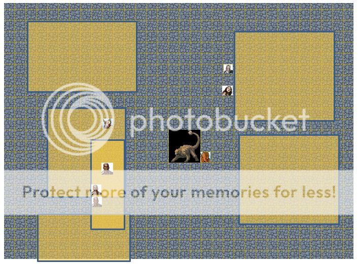 Quinta ducks behind the dino for cover from the archers and starts to cast Summon Monster I.