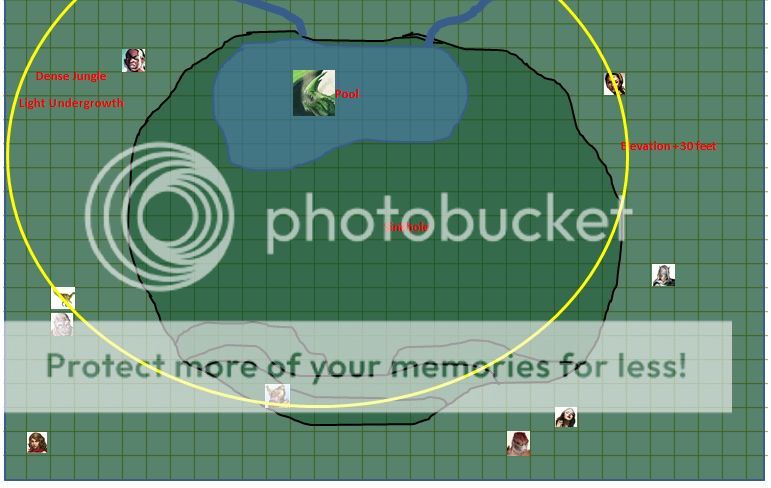 Battle Map The yellow line indicates the range of the dragon's frightful presence. I'll update tomorrow with the dragon's action, in the meantime if Yekskya posts, I'll include his readied action. Zaghigoth, you might get to use your healing wand! Oh, and just realized the map still includes Rowena, at the moment he is running raving through the jungle, panicked.