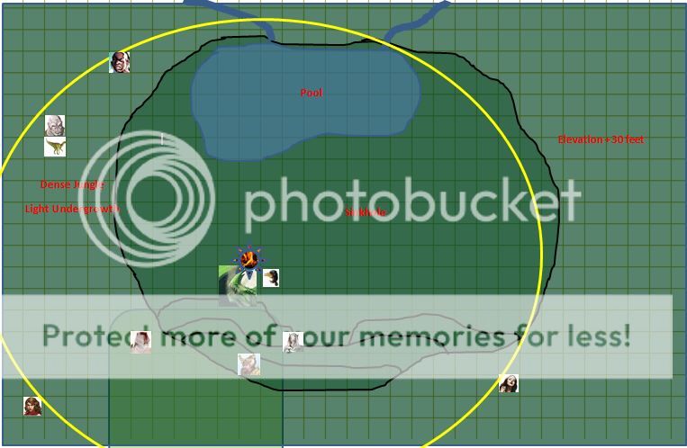 Focused on his spell, Zag only manages to twist away from the blast of acid due to a warning call from Oshok'arr and a push from the iguanodon sens him out from the full brunt of the blast, though the acrid breath still sears parts of arm and leg. The dinosaur, however, is not so lucky and receives a series of caustic burns. Further, the burn and the distraction are enough to cause Zag to lose focus on his spell, and he feels the divine might of his conjuration slip away, back to the spirit realm. Needed a DC 22 concentration check, so lost the Summon Nature's Ally II.