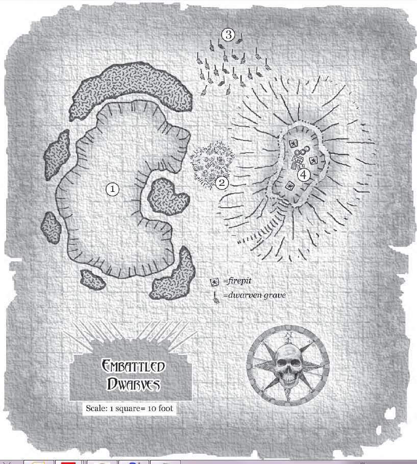 Dozens of fresh mounds of earth mark new graves in this makeshift cemetery. At the head of each rises a broken weapon haft to serve as marker. There are exactly 21 graves. The breaking of the haft of a warrior’s weapon (usually an axe, hammer, or pick) is a tradition of the Stoneheart Clan to denote death in battle, the Thane explained.