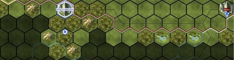 The expedition continues through the forest along the banks of the river, which cuts and winds through the area. The tracks are not difficult to follow, but are growing fainter with every mile. About an hour after beginning to follow the river, the trees begin to thin while the ground grows rockier and more uneven. The tracks are extremely faint, obscured by time and the hard ground.