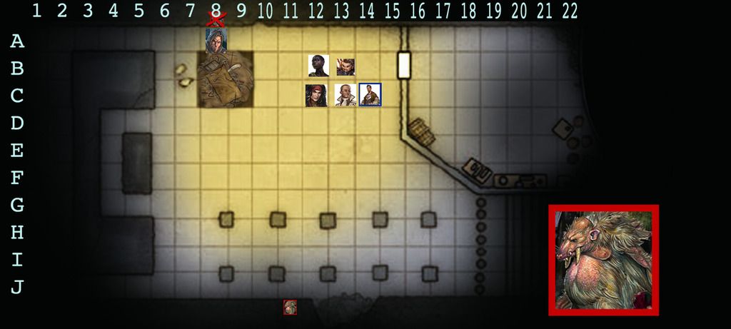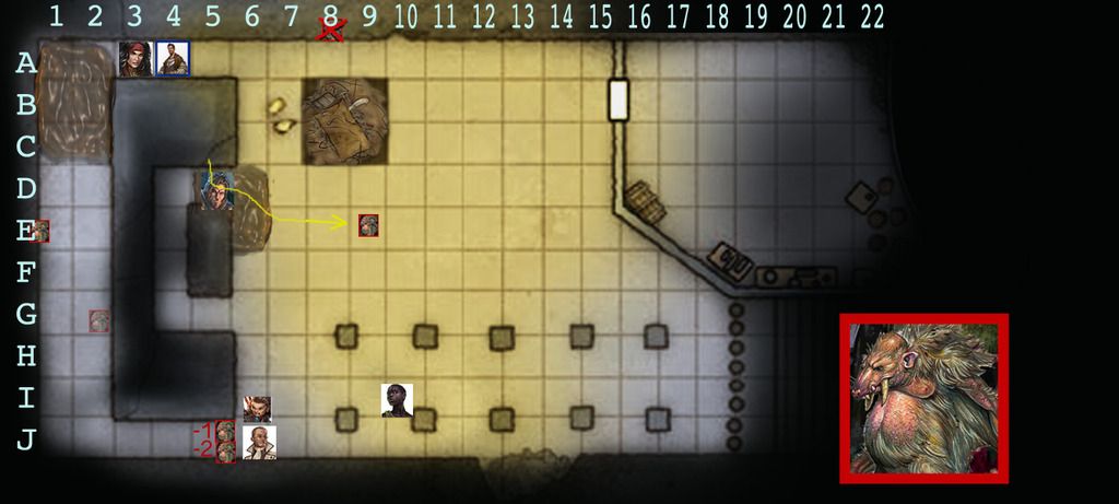 Seeing the master gnome rush forward with little apparent consideration for possible danger, Asha trost dutifully after him, not wanting to leave him alone in the gloom with these strange creatures. Double move to I10.