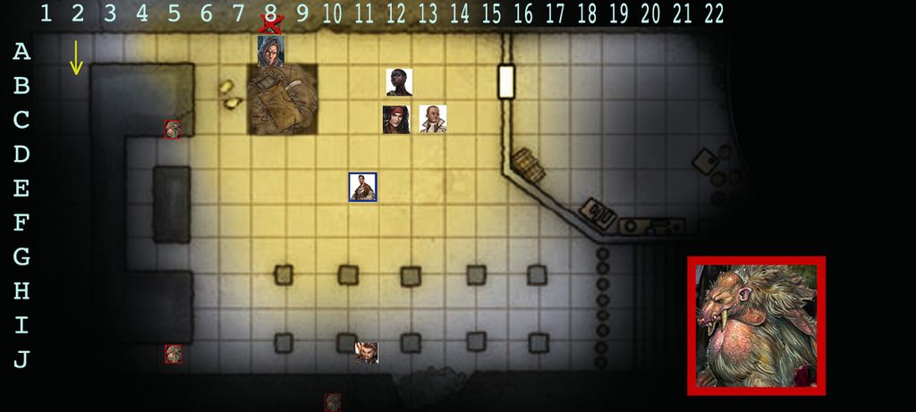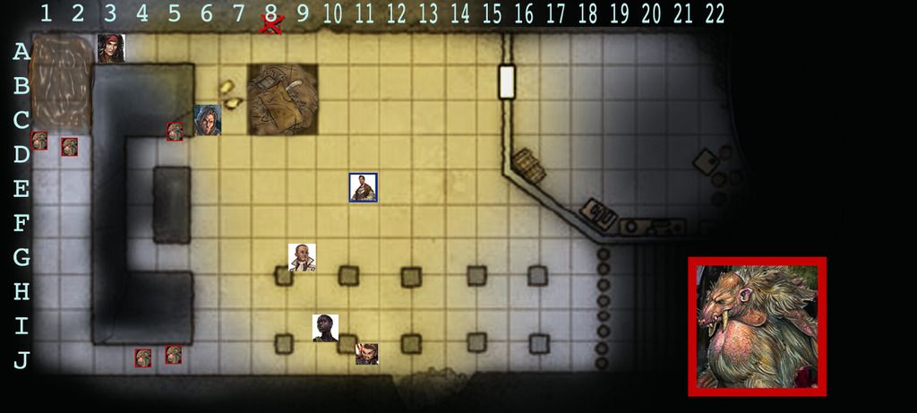 The two blocked by Bastargrae and Indio move up and bite at them... one bears a minor wound from Indio.