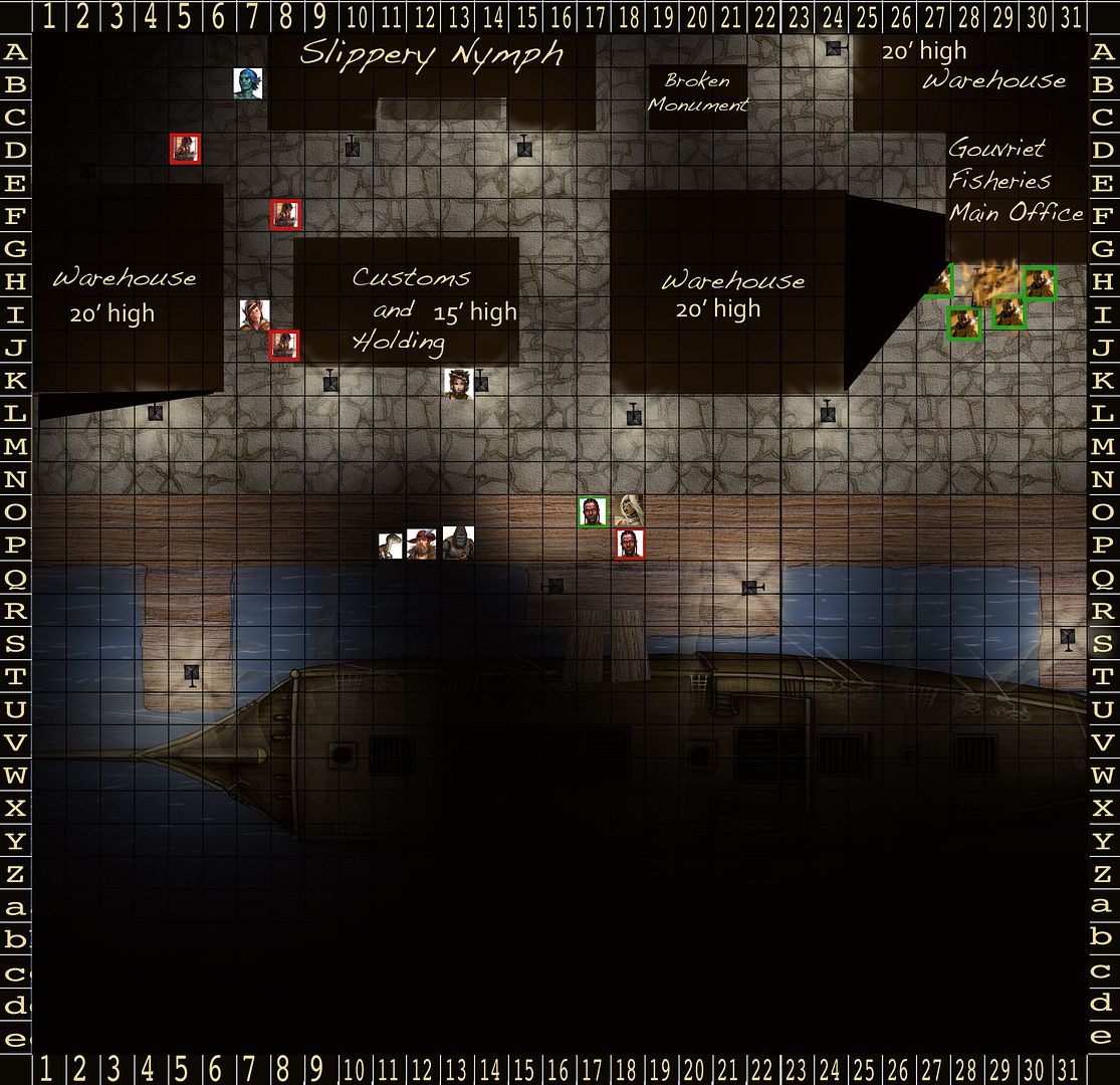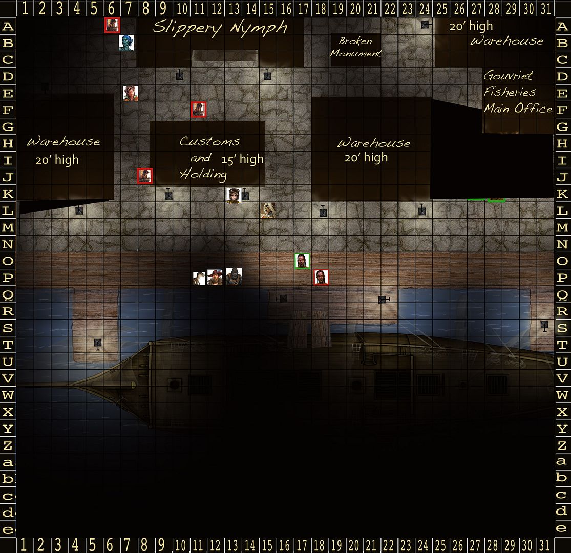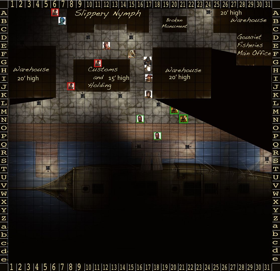 Ghiv realizes that everyone will be moving the way of the sailor and decides that as always stealth is the better tactic. He moves down the opposite alley between Customs and Holding and the Warehouse. As he approaches the alley he draws his rapier in his right hand letting the concealed dagger in his left slide into view.