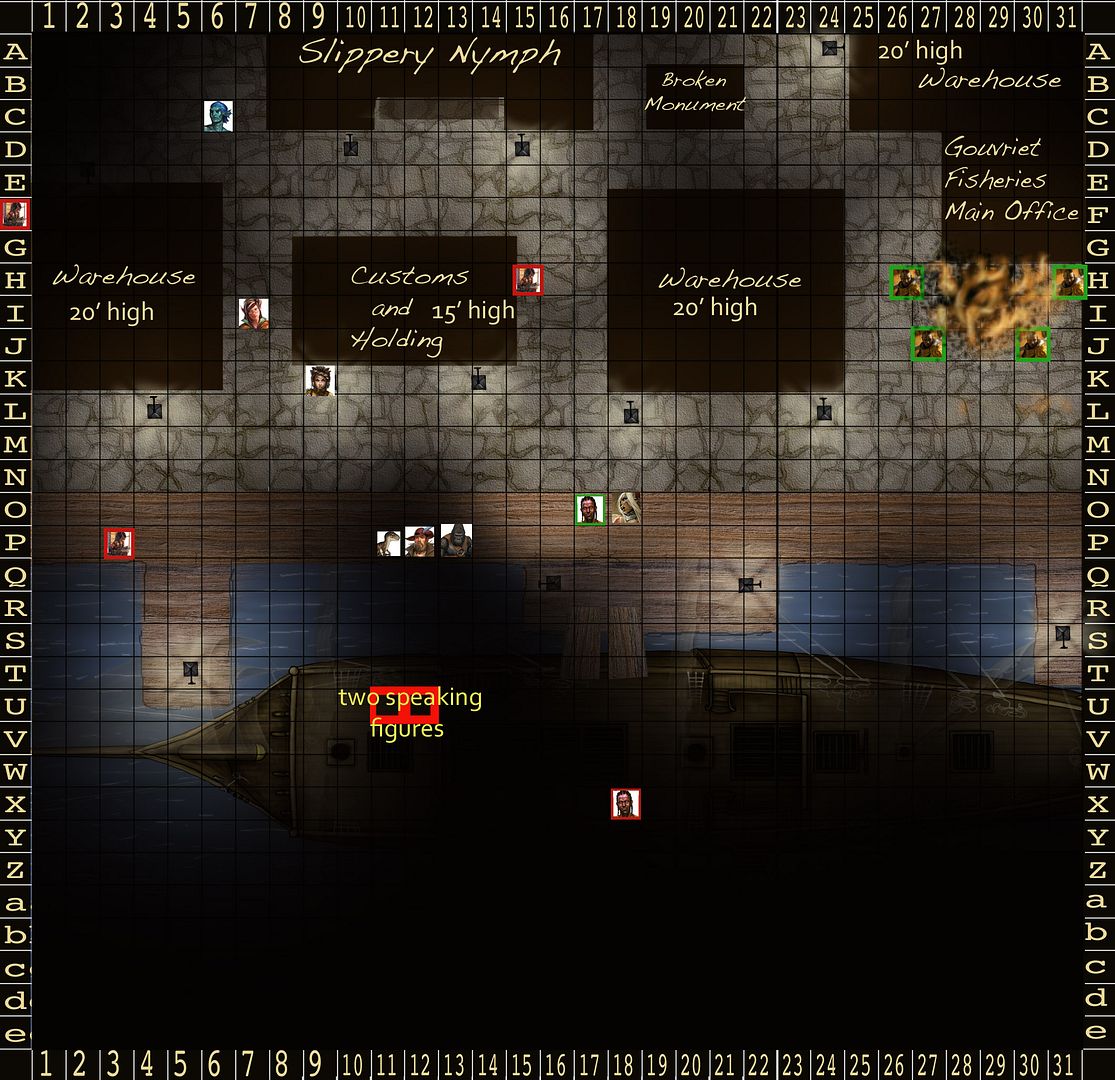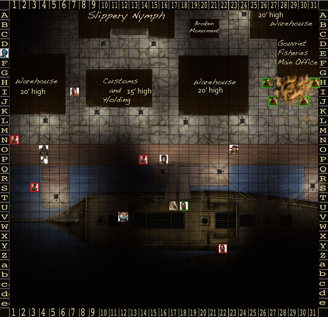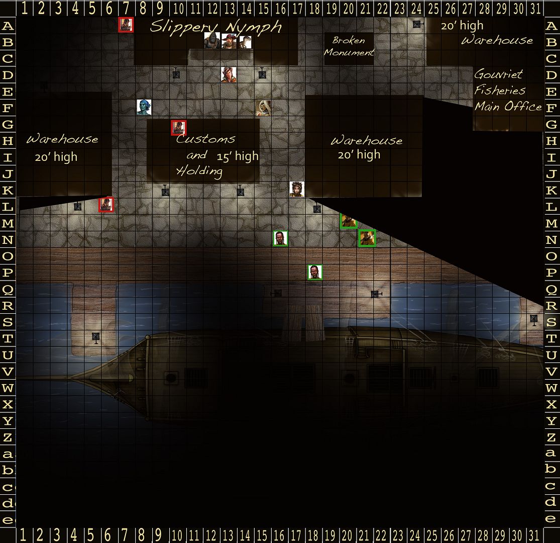 Ghiv realizes that everyone will be moving the way of the sailor and decides that as always stealth is the better tactic. He moves down the opposite alley between Customs and Holding and the Warehouse. As he approaches the alley he draws his rapier in his right hand letting the concealed dagger in his left slide into view.