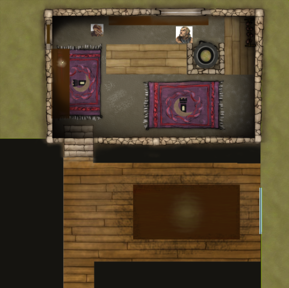 To the right is a den. The curtains are little too small for the window, but are pulled tight. The den is filled with stuffed game, rare weaponry, and the lingering smell of pipe smoke.