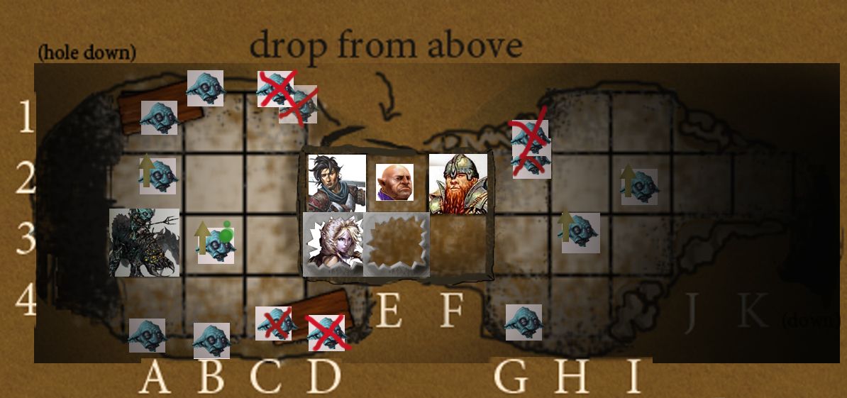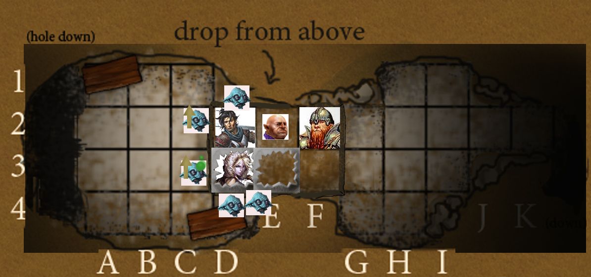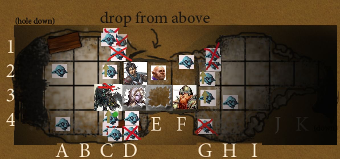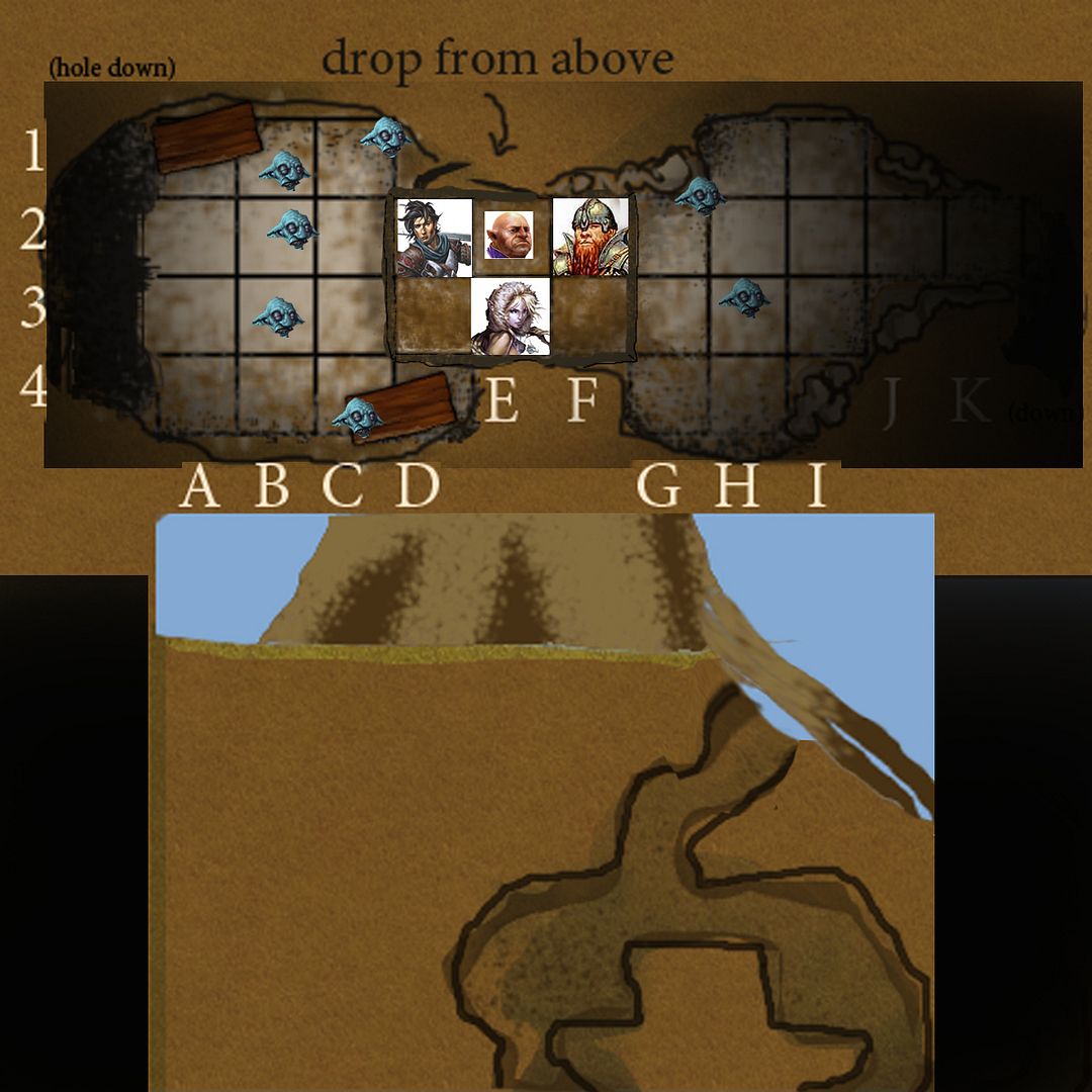 You then hear hoarse derisive laughter from down below. "Ha! Blue devils die! Grompum prah!" The laughing then turns to a string of hacking coughs.
