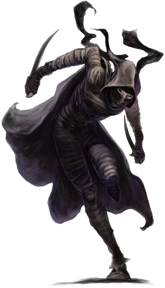 You're almost back to the gate house when the shadows suddenly surround you, dimming the sunlight. A figure steps out in front of you from behind a pile of junk. Though the darkness make its form indistinct, Fireday and Viv can see it clearly. This tall humanoid's pale brow and black, soulless eyes are all that can be seen above a black scarf wrapped around its face.