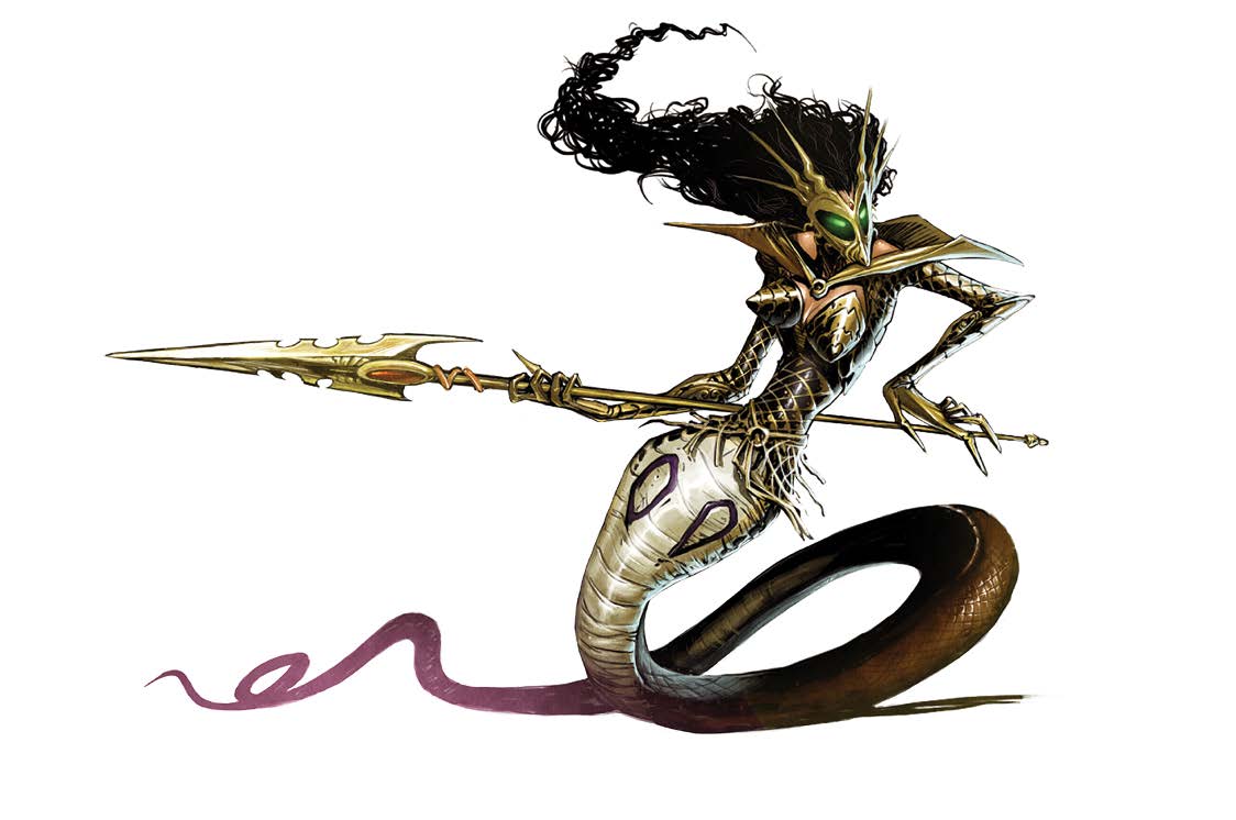 Before Karmid can react to Flutter's warning, a terrifying creature appears out of nowhere in the space next to the angel statue wielding a wicked-looking longspear. It has the lower body of a snake and the upper body of a woman and her entire body is covered is glittering golden snake scales. Her face is disguised behind a golden mask from which six writhing snake tails radiate. She jabs it into Karmid' shoulder. As the spear pierces his skin, it emits a disturbing shriek that sounds as if a hundred people cry out in terrible pain.