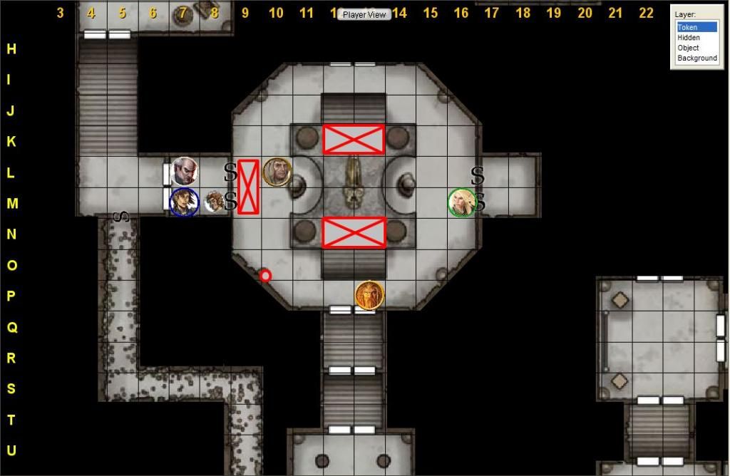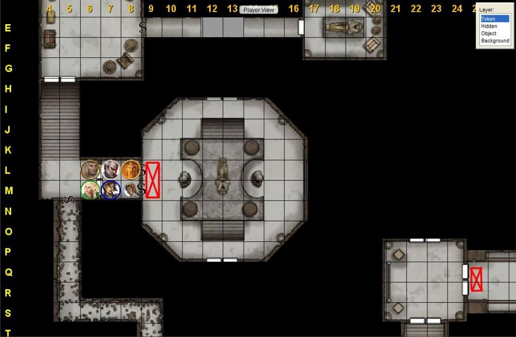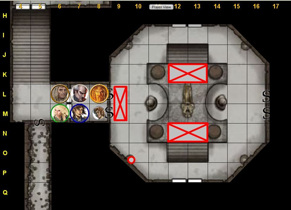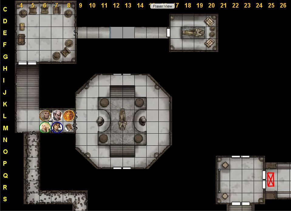After nearly an hour of meticulous, methodical and careful searching, Mus'ad believes that he fully understands the workings of the room. The room flooding trap is triggered by either the pressure plate in front of the west doors or the by the ones he finds on the central platform. A bypass switch is hidden in the torch holder in the southwest corner of the chamber. A pair of secret doors are located on the east wall. The room is drained through a “rubble drain” of loose gravel built around and underneath the room. He suspects the water is introduced via the northern doors. The southern doors are locked.