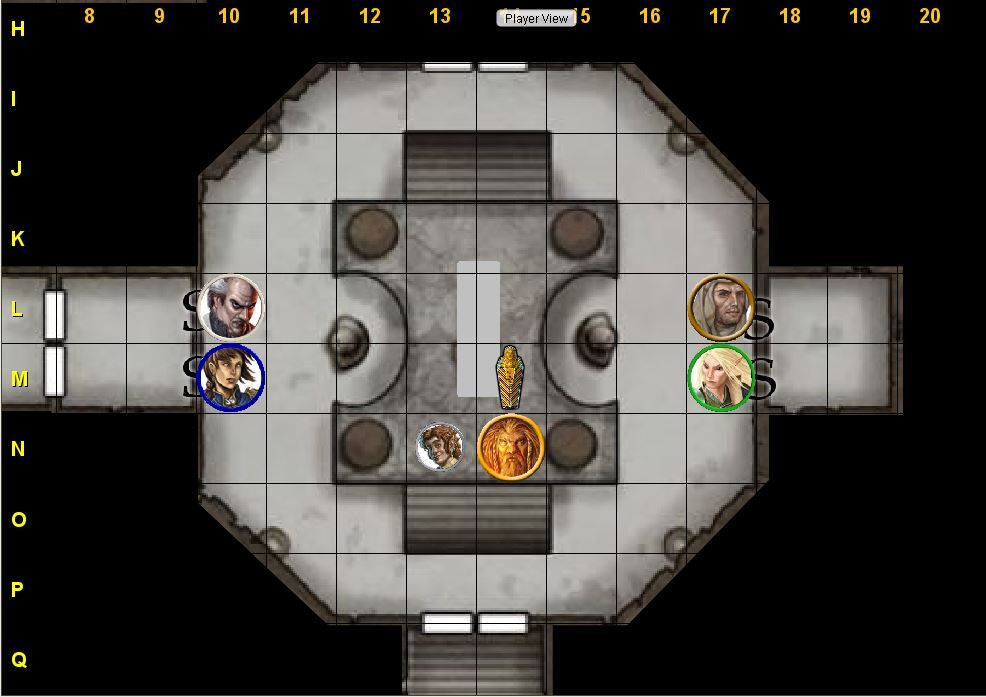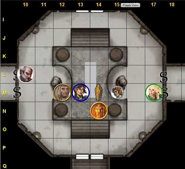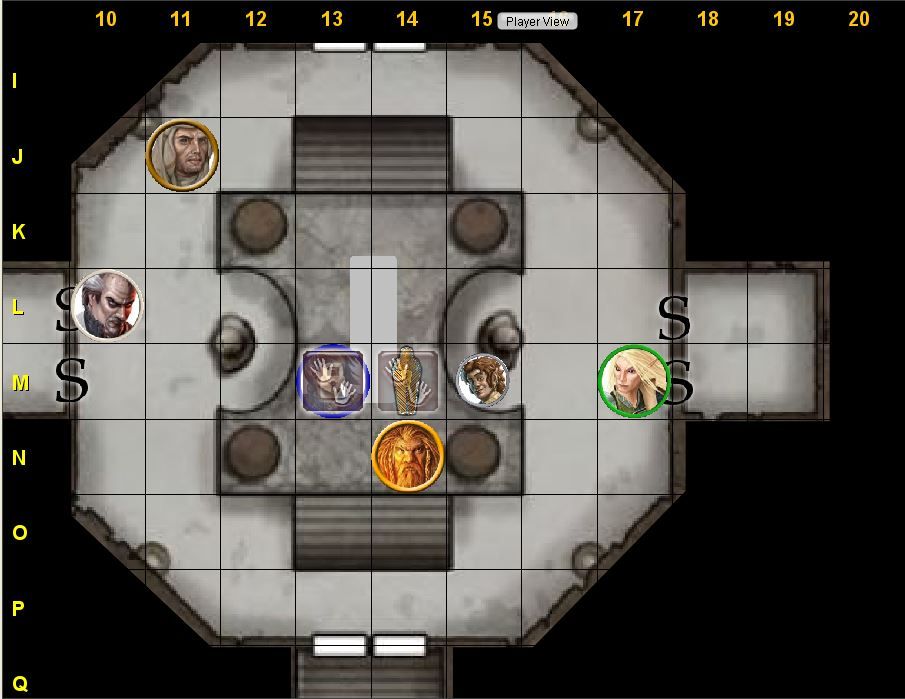 Dodging and weaving, Myron moves past Mus'ad and stands by with his Sling Staff raised, ready to pummel the animated object. Tumble to M15 to provide flanking for Pherenike, ready action to strike if the sarcophagus takes hostile action or one of his allies attacks it.