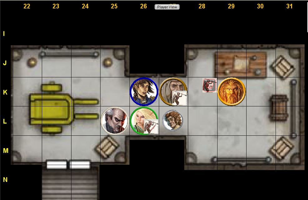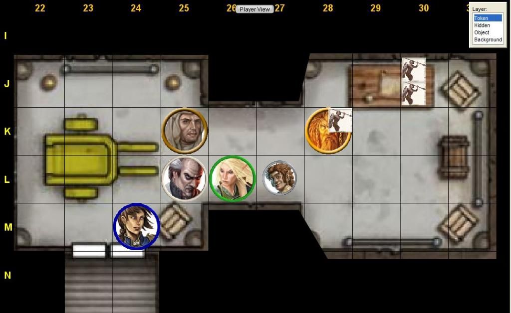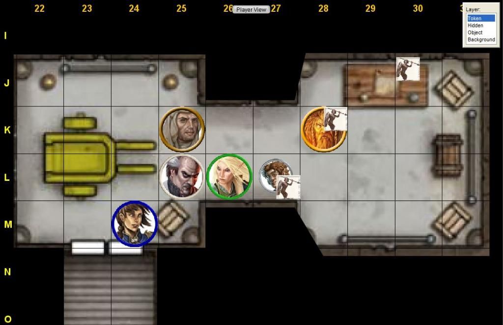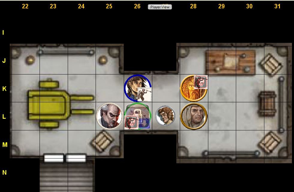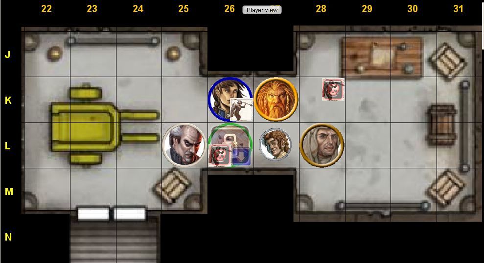 5-foot-step to K25; attack toy soldier in K26 (flanking, Aid Another) 1d20 + 6 + 2 + 2 ⇒ (19) + 6 + 2 + 2 = 29 damage 2d4 + 6 ⇒ (3, 4) + 6 = 13 confirm? 1d20 + 6 + 2 + 2 ⇒ (2) + 6 + 2 + 2 = 12 damage 2d4 + 6 ⇒ (3, 2) + 6 = 11