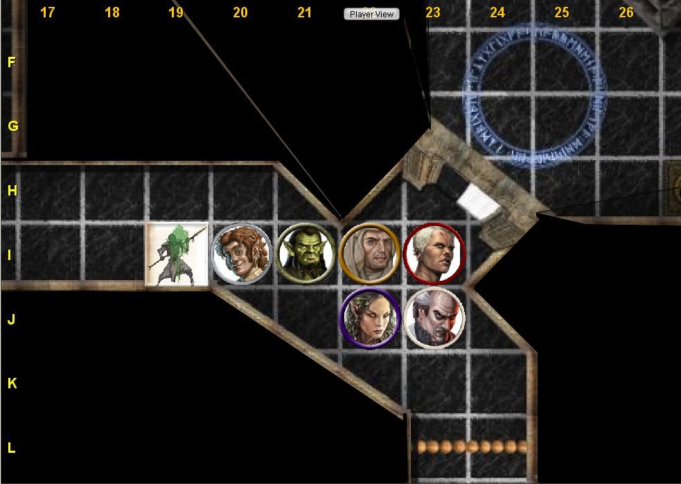 The musetouched elf takes a step into the hallway. She murmurs a short Celestial phrase and flicks her wrist in the general direction of their foes, and a small light separates itself from her halo. It flies over to Velriana, hovering over her for a brief moment before bursting into a shower of lights as fine as dust that descend over her and those near her. Five-foot-step to I22, then using her Glitterdust SLA (DC13).