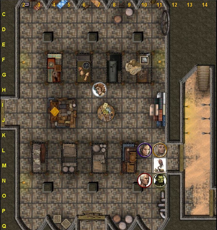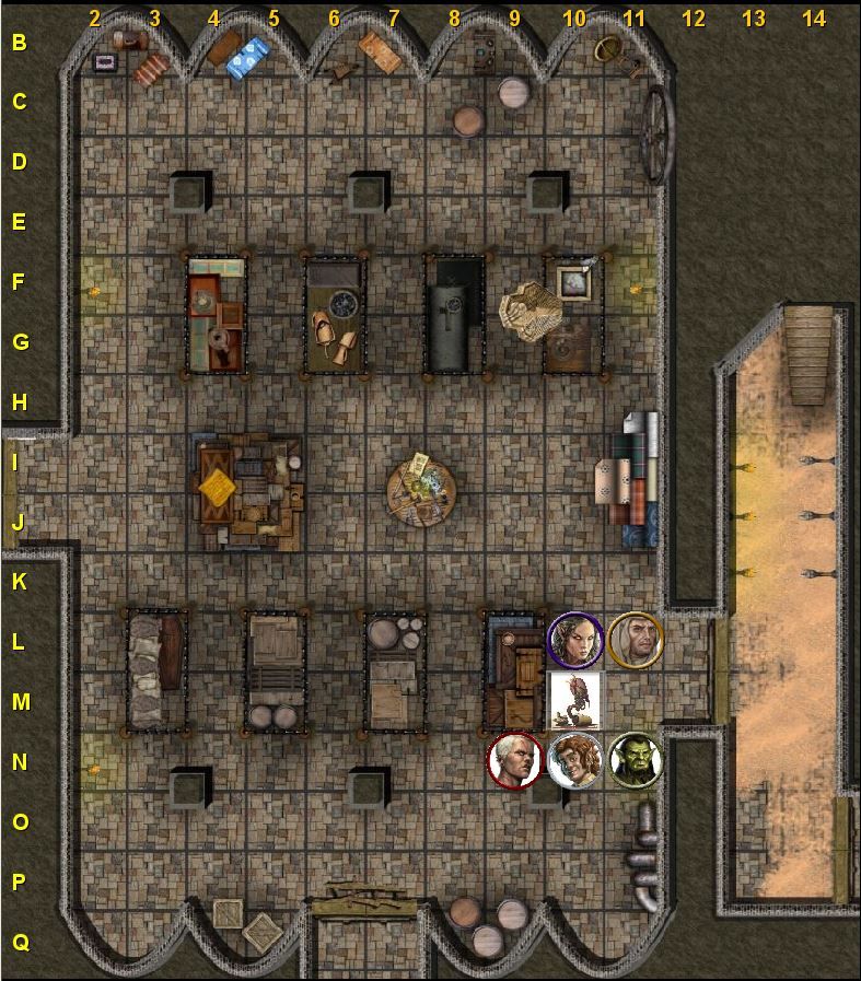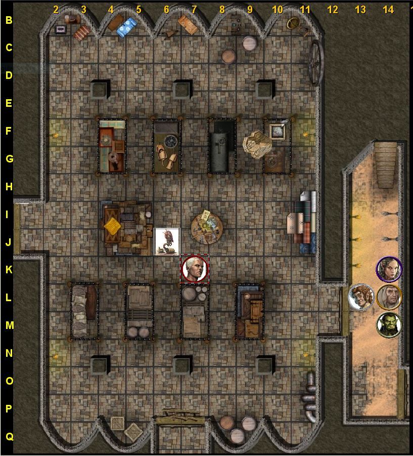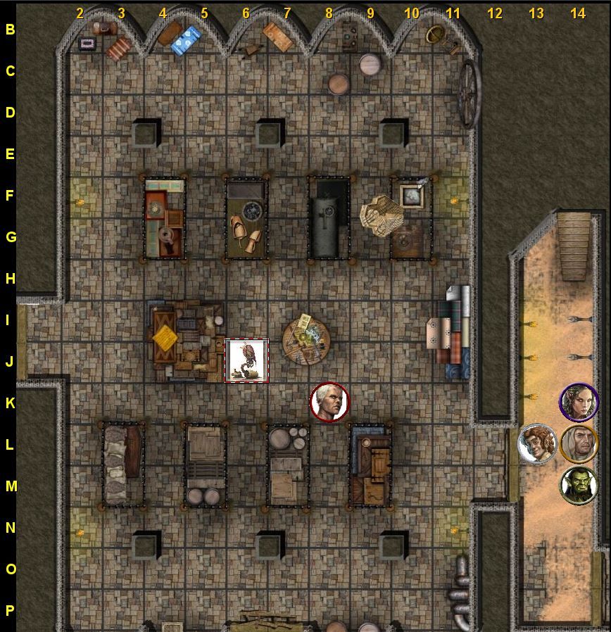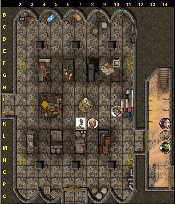 As Myron listens to Elrisiel quickly share her knowledge of the undead monster, he realises that his blades will be of little use in this fight. Instead, he retrieves a tanglefoot bag from his pack and moves to get a clean shot.