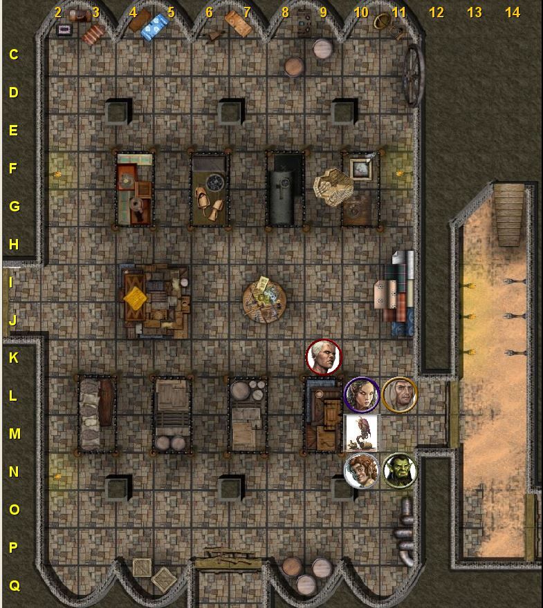Myron circles around the table and flings his tanglefoot bag but the agile tekenu shifts easily out of its path, leaving the projectile to explode on some barrels behind it.