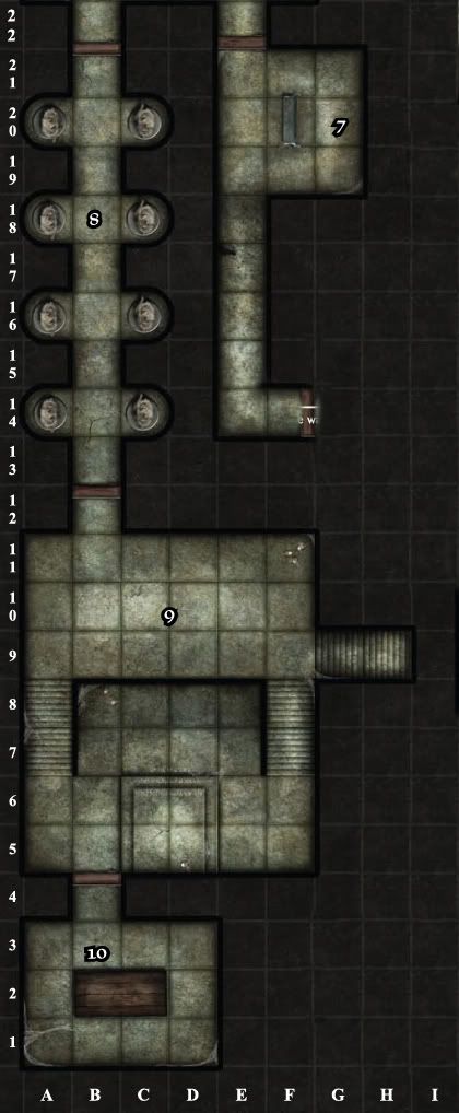 A small stone bench sits in the center of this dusty chamber. On the far wall is a faded mural depicting the hero Kassen defeating the mercenaries at the entrance to this crypt, with his blade piercing the chest of the mercenary leader. These figures stand alone in the center of the scene of carnage, with dead villagers and mercenaries all around them. I will need a perception check from everyone.