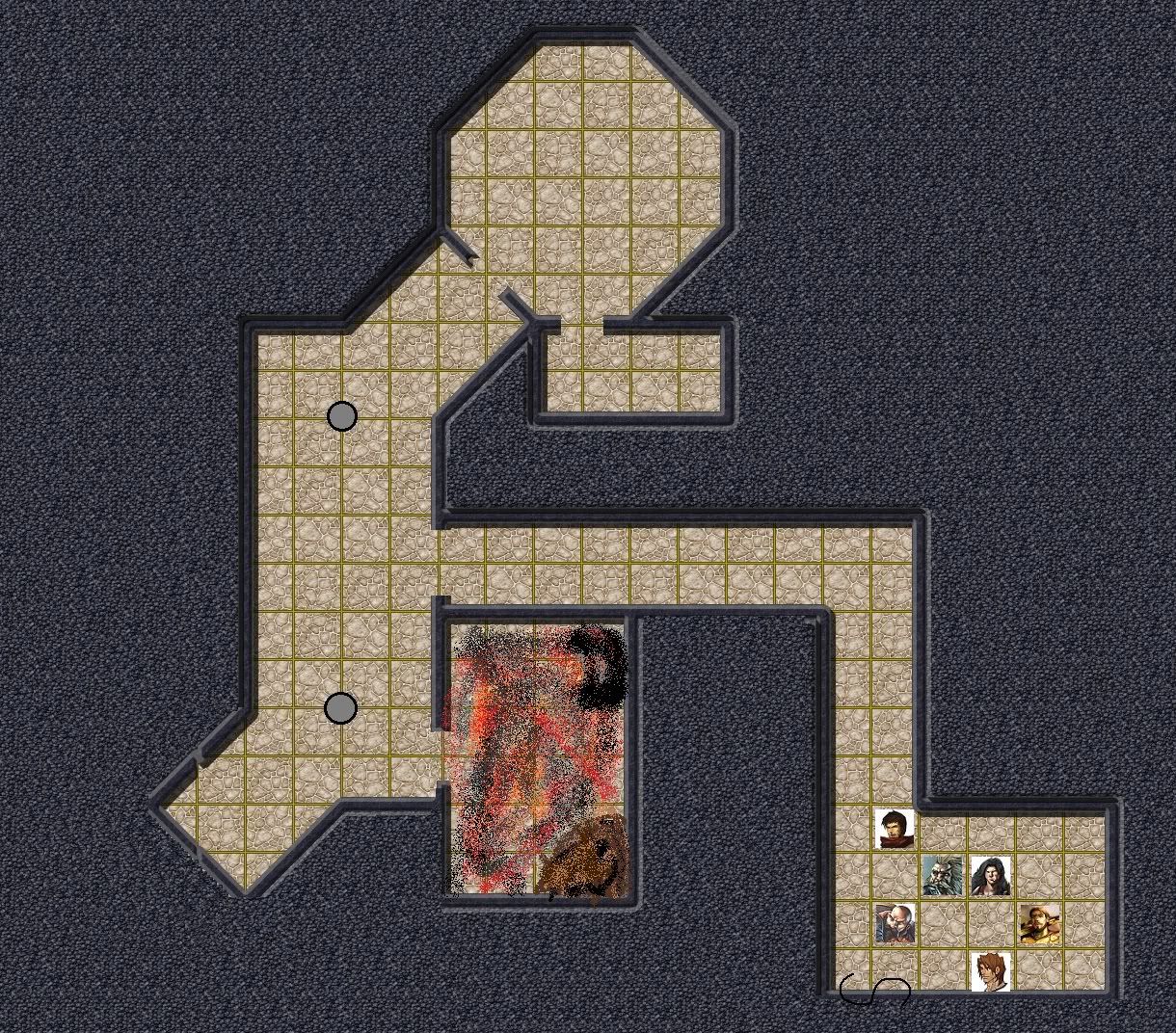 The secret opens into an unlit hallway that proceeds about 50 feet before bending to the south. Dreygard cautiously scouts ahead, and finds a room with dozens of weapons neatly arrayed on four wrought-iron racks standing against the west and east walls. Pushed against the north wall are two tables covered with suits of armor.