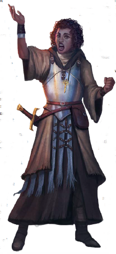 Commander Bishop, her Lieutenant and their squad lead the march on horseback. as they approach a man and woman ride out to meet them. The woman is of Iobarian descent - she has tight, curly hair and dark skin, and is clad in a breastplate adorned with a prominent holy symbol of Iomedae - her breath puffs white in the cold autumn air. The man likewise has a wooden symbol of Iomedae that bounces on his chest, his eyes bulge, and his nose and mouth droop downward, accentuating the weakness of his chin. Although he wore an ascetic's tonsure, he had not kept it clean; stubble flecked his shaved scalp. Blinking at the group, he resembles a surprised and irresolute tadpole.