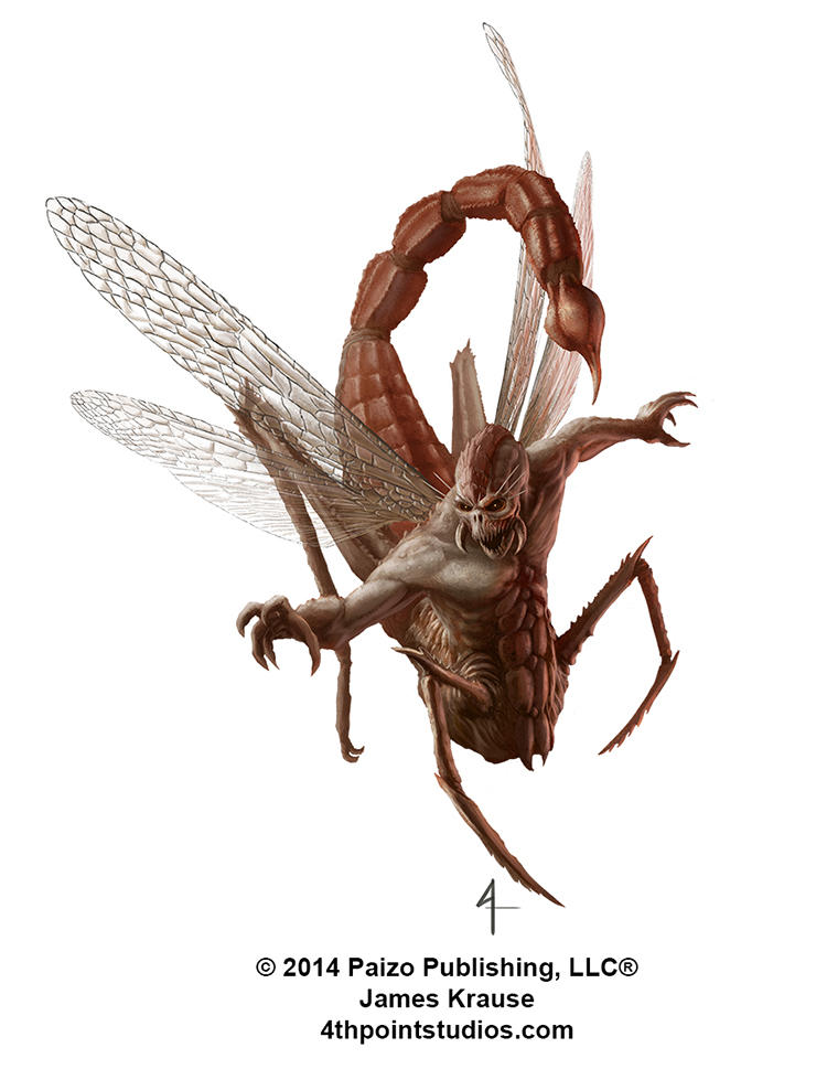 You look up and see some sort of demon the size of a horse. Its insectoid body is that of a scorpion, but as if it were some sort of abyssal centaur, its upper torso, face, and hands are almost human-like. It flies about 60' above, staring at you staring at it, but it doesn't do anything but hover.