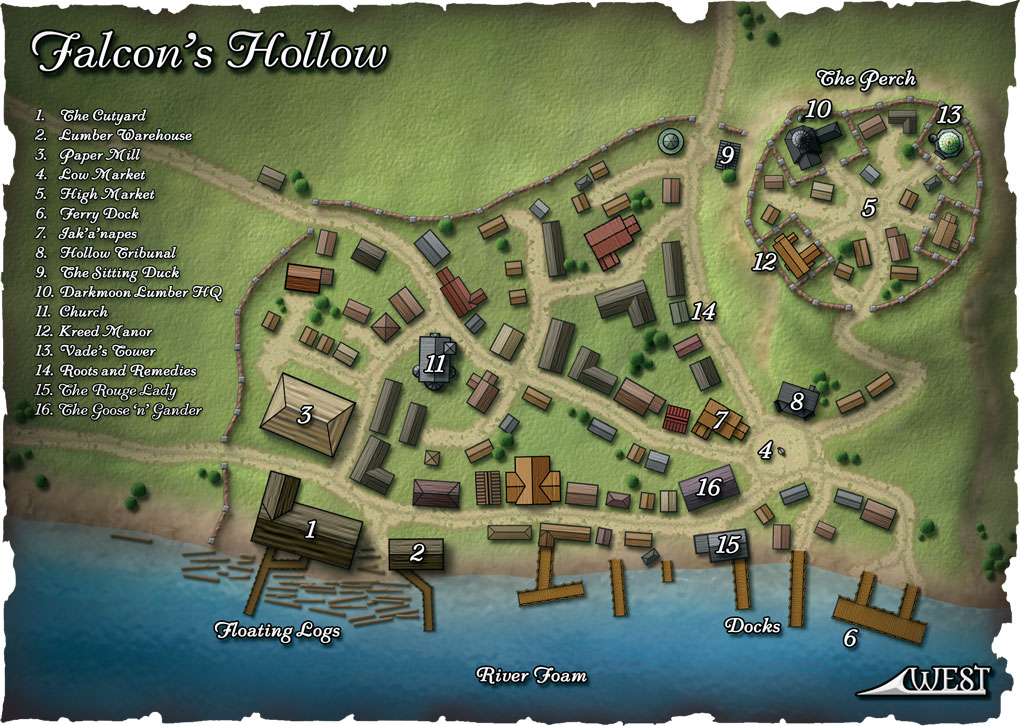 The group bids Laurel farewell and prepares for the journey to the Lumbar Camp. Even with the map, you are concerned about navigating the Darkmoon Vale without a skilled woodsman. A guide will probably be required to find the three locations that Laurel mentioned. You collect the supplies you need for the journey and head out of Falcon's Hollow.