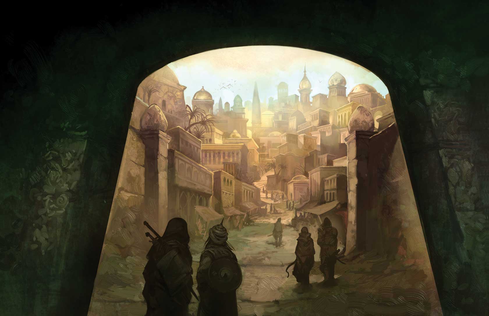 Katapesh is indeed dusty and hot, but oddly beautiful, stretched out before you. Tall buildings of stone and squat wooden shacks sit side by side and deep-voiced merchants loudly hawk their wares as you are shouldered aside suddenly by a man leading a laden camel into the city. "A thousand pardons, sirs and madam." He calls over his shoulder before being swallowed by the city's crowds.