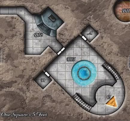 This huge room looks like nothing more than an immense underground cathedral. Stone doors stand to either side of the main entrance, but beyond this, the walls are carved with strange, spiky runes. In the center of the room is a large pool, a ring of polished human skulls balanced on stone spikes arranged in circle around the deeper midsection. At the far end of the room, a pair of stone stairs leads up to a pulpit on which a second pool, this one triangular and filled with chuming, bubbling water that looks almost like translucent lava. Yet while wisps of what look like heat and stream rise from the strange orange liquid, the room itself is deathly cold.