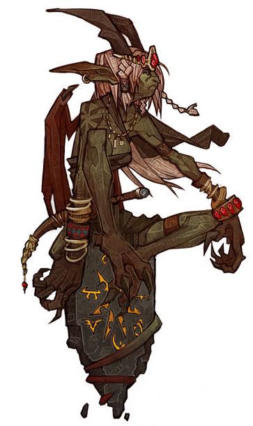 When it gets to the top, you can all now see what advances. A large, mutated goblin, wielding several weapons, slips on the greased steps, but leans on the wall to keep himself from falling.