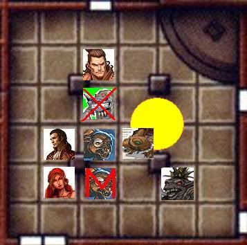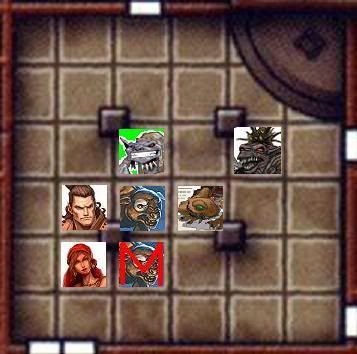 Ripnugget raises his arms to attack and loses control of the weapon as it goes flying away from him. Quick on his feet, the goblin chief turns and runs around the northern side of the room to his masterwork dogslicer (Praxim and Vuvo get an AoO).