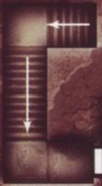 The stairs continue another ten feet after the corner. At the bottom, around another corner, a stone door hangs slightly ajar, the detailed carvings that once covered its surface defaced chisel marks and hammer blows to the extent that only a few remnants of images (mostly of gemstones and crowns) remain. The floor here is slanted toward the west.