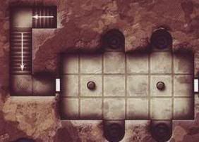 The door opens easily into a wide hall. Two pillars support the ceiling in here. In many places, the stone walls, ceiling, and floor are caked with ancient grime and soot. Acloves in the north and south wall contain partially damaged statues of a man in robes clutching a book and glaive. The entire room is canted toward the west, and whatever ancient upheaval caused the complex to tilt knocked the statues from their bases so that now lean against the southern walls of their acloves.
