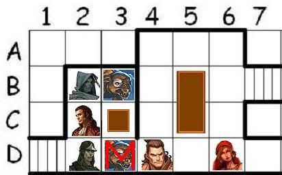 Seeing the foes prone, Praxim drops his bow, drawing his curve blade as he advances. Can he climb onto the table in C3? If not, can he get around the warrior and onto the stairs?