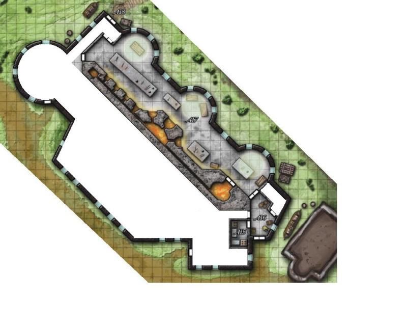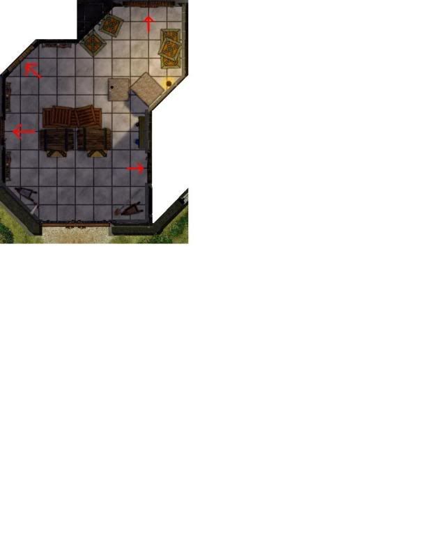Varg squeezes through Markum and Vuvo and steps over the dead goblins to get to one of the live ones, stabbing it through its chest. It falls before the warrior. The goblin just behind turns its smile into an expression of fear, turning and fleeing to the other end of the room and out the doors, making a left after it leaves the furnace room. The injured goblin behind the table, near the furnace, likewise flees making it near the same exit.