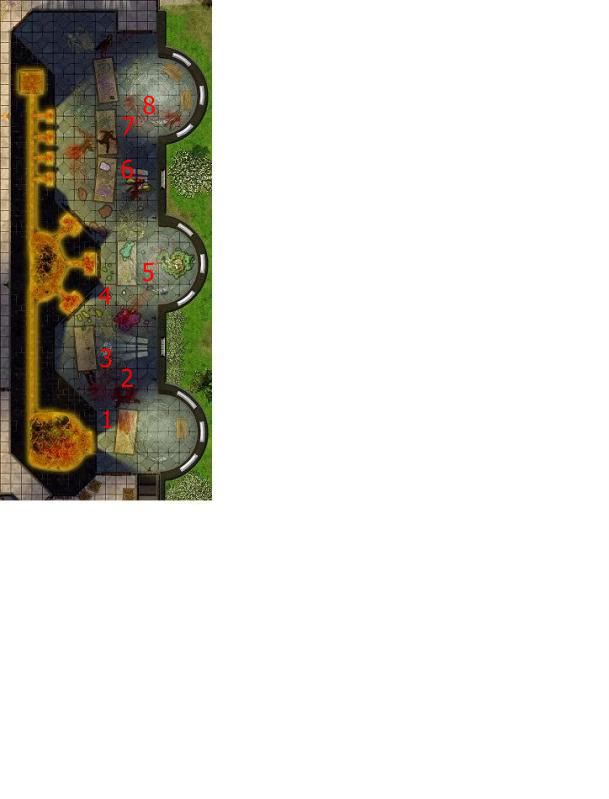 Lym moves forward, stops one square past and to the right of Lona so she keeps an open firing field. Lym casts Daze at the Goblin who is then up from her in a straight line, on the other side of the table. Will save 13 to negate. It would be helpful if you could add letters and numbers to the rows of this map. ^^;