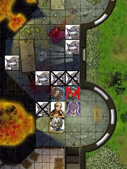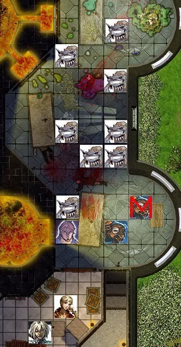 The injured goblin near Vuvo tires to run as well, but is caught by Vuvo and torn apart. Lona's attack misses the only visable goblin still on its feet. No opponent is close enough for Lym's attack to hit.
