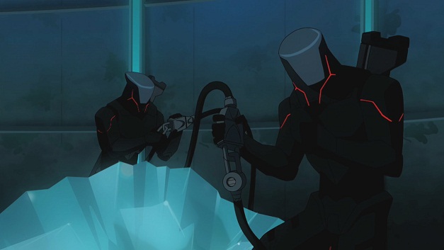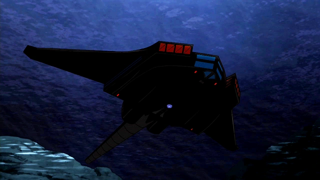 At the same time, the manta ship catches up with Forzare and Robo. A hatch opens on the roof of the sub, where the head of a ray would be, and a squad of black and red clad Manta Warriors spill out.