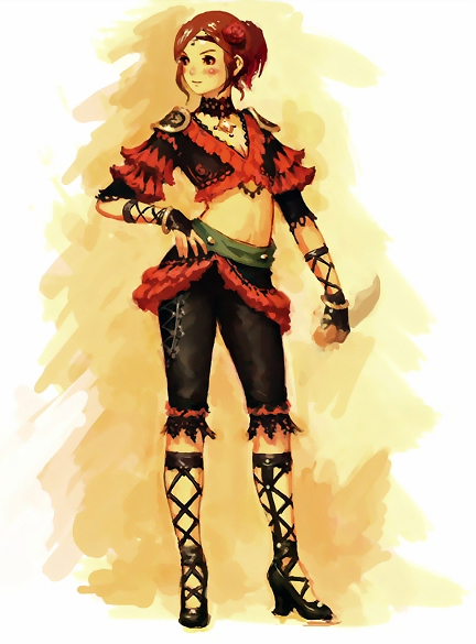 「There’s another one here!」 A young girl in bright pink taps out from behind the building on stiletto heels, holding a bow. Another girl in an identical baby blue dress follows suit, taking the first girl’s free hand. In her own hand, she holds a small mace in the shape of a rattle. The two of them are like twin angels. They are followed by a willowy figure in green robes wearing a jade amulet. The three of them appear to be of an age.