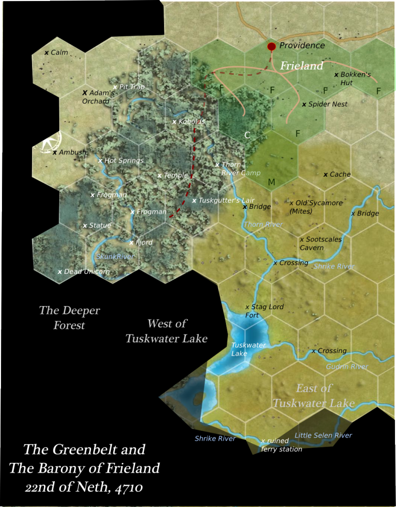 Kriger leading the chase, you keep to the trail and make good speed as you move southwest then south, into the Narlmarches Forest. The day comes to an end as you are on an old game trail. Kriger believes the trolls are still two days ahead of you. Weather looks clear, if cold, and he's confident he could follow the trail if the trolls remain careless.