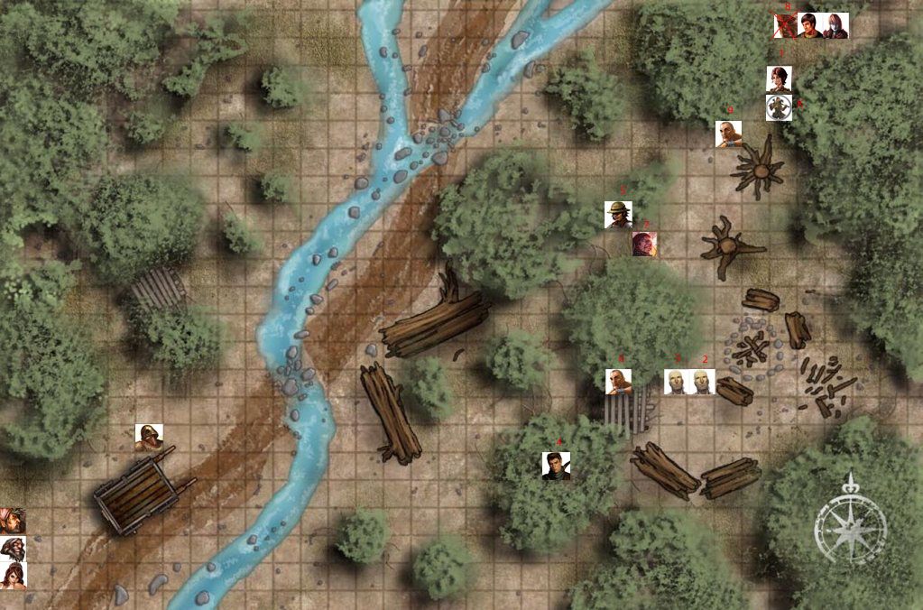 I should be fine, though a new map soon may be needed. I will wing it with two posts below. Post 1) will be if either bandit 3 or 5 is within charging range (remember the stream shouldn't hinder a charge for me because I am large sized now) - Also keep in mind I believe my threat range with my pole-arms is 15' and 20', so I can get them from fairly far... while Post 2) will be if they are not within charging range. Does that work?