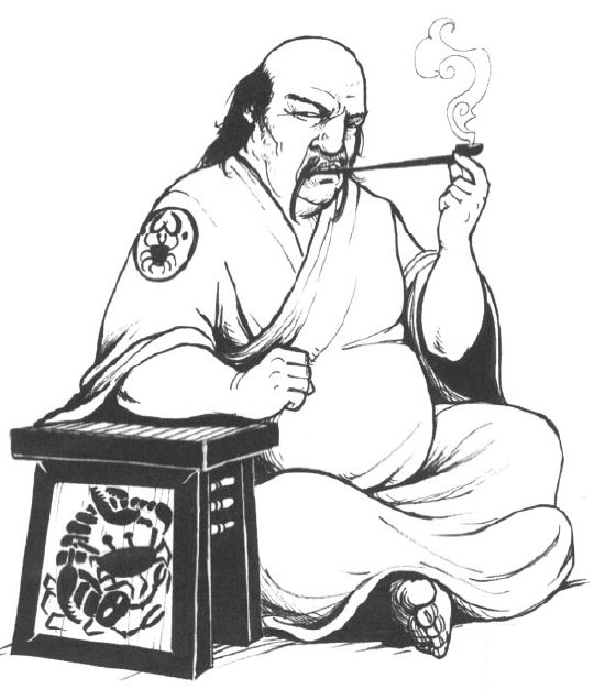He eventually answers the door and greets you. Muchi-san is indeed an imposing figure, but not muscular in the way that many Crab bushi are. His physique may have once been powerful but the aging samurai is both balding and overweight. His appearance isn't helped by his obviously poor regimen of personal hygiene. An expression of joviality fades to a dour scowl when he sees a magistrate and yoriki on his doorstep. He pulls his smoking pipe from his lips and sneers: